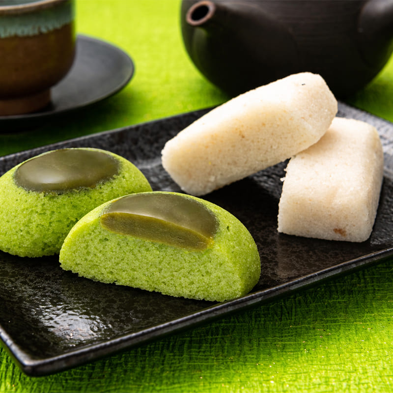 砂糖(国内製造)、茶あん(白生あん、砂糖、水あめ、粉末抹茶(霧島産)、その他)、米粉、山芋、マルトオリゴ糖、粉末抹茶(霧島産)/トレハロース、着色料(紅花黄・クチナシ)、(一部に山芋を含む)