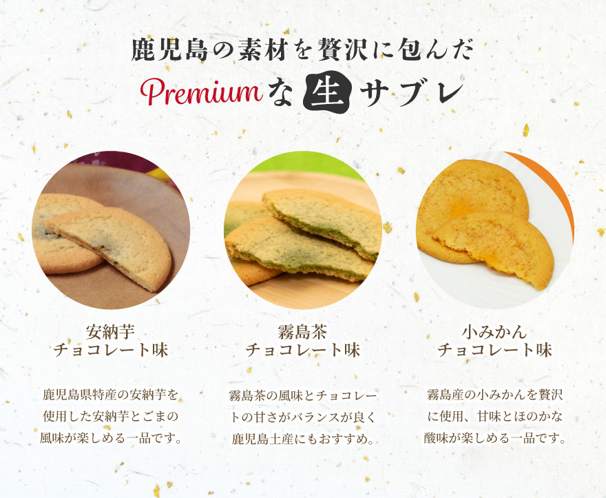 (安納芋チョコレート味・霧島茶チョコレート味・小みかん味 各10枚)